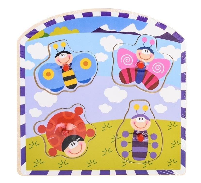 Edukacyjna układanka drewniana dla dzieci przedstawiajaca łąkę i jej mieszkańców, rozwija spostrzegawczość i koordynację wzrokowo-ruchową. Puzzle z uchwytami uławiającymi ich przenoszenie.