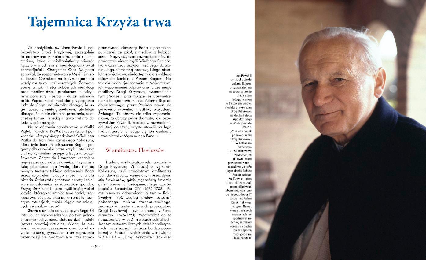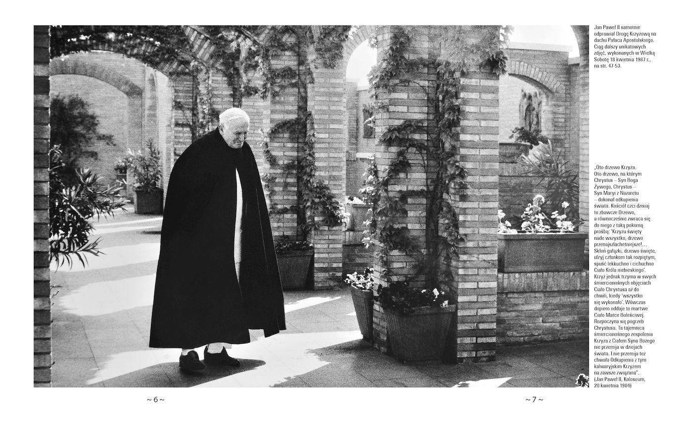 Wszyscy kojarzymy wielkopiątkowe Drogi Krzyżowe z Janem Pawłem II w Koloseum, pamiętamy, jak wielkim czcicielem Krzyża był polski Papież. Mało kto jednak wie, że Ojciec Święty niemal co piątek odprawiał nabożeństwo Drogi Krzyżowej na… dachu Pałacu Apostolskiego. Znajduje się tam ogród z 14 stacjami wykonanymi na polecenie Pawła VI. Jedynie Adam Bujak i to tylko raz miał zaszczyt fotografować rozmodlonego, głęboko przeżywającego Mękę Pańską Jana Pawła II w tym niezwykłym miejscu…