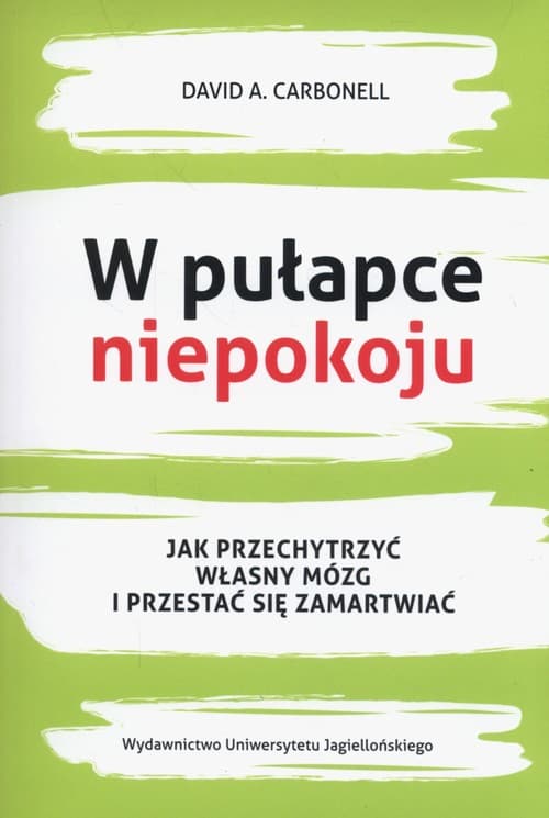 Ta fantastyczna książka uczy czytelników, jak za pomocą prostych i łatwych metod zostawić lęk za sobą. David A. Carbonell przystępnie i zajmująco tłumaczy, dlaczego stare, sztampowe strategie zwalczania lęku nie działają i czemu nasze wytężone wysiłki pozbycia się niepokoju zwykle kończą się porażką. Autor odwołuje się do metod zaczerpniętych z dwóch głównych nurtów leczenia zaburzeń lękowych – terapii poznawczo-behawioralnej oraz terapii akceptacji i zaangażowania. Podpowiada, jak przerwać błędne koło zamartwiania się, spojrzeć na swoje lęki z dystansem i przechytrzyć własny mózg, by już nigdy nie wpaść w pułapkę niepokoju. Książka Davida A. Carbonella będzie świetnym uzupełnieniem terapii osób zmagających się z chronicznym niepokojem związanym z zaburzeniami obsesyjno-kompulsyjnymi, fobią społeczną czy zespołem uogólnionego lęku (GAD). To także idealna lektura dla tych, którzy zadręczają się troskami jedynie od czasu do czasu i nigdy nie poddawali się psychoterapii. Skorzystają z niej również profesjonaliści, którzy chcą poszerzyć swoją wiedzę na temat terapii zaburzeń lękowych. "Wreszcie powstała książka na temat lęku, którą mogę polecać moim pacjentom, mając pewność, że dzięki niej lepiej zrozumieją naturę nękających ich uporczywych obaw i zyskają umiejętność radzenia sobie z nimi. Tak wielu moich podopiecznych zmaga się z przewlekłym lękiem i jak dotąd ich poszukiwania odpowiednich środków i technik okazywały się daremne – dopiero Dave Carbonell ofiarował im to, czego szukali: skarbiec porad i pomysłów na to, jak radzić sobie z niepokojem. To nadzwyczaj zajmująca lektura, którą z pewnością będę polecać wielu osobom zwracającym się do mnie o pomoc." Dr Robert W. McLellarn, założyciel i kierownik ośrodka Anxiety and Panic Treatment Center w Portland