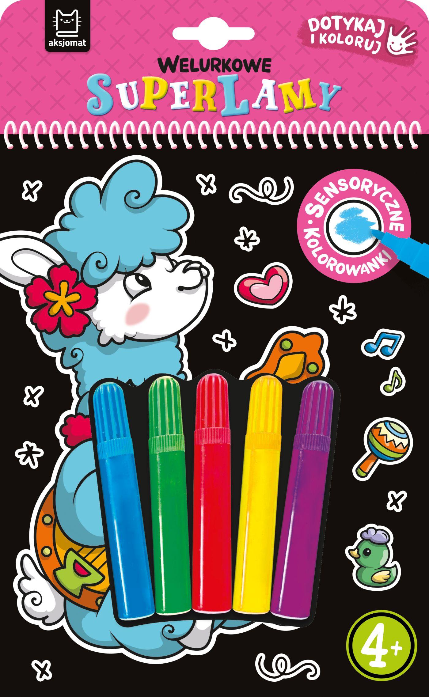 „Welurkowe superlamy” to kolorowanka sensoryczna z dołączonymi pisakami. Tło obrazków pokrywa czarny welur, który podkreśla głębię kolorów, zapewnia wrażenia sensoryczne i ogranicza wychodzenie poza linię. Dzięki perforacji pokolorowaną pracę można oderwać, włożyć do ramki i podarować w prezencie lub ozdobić nią pokój.