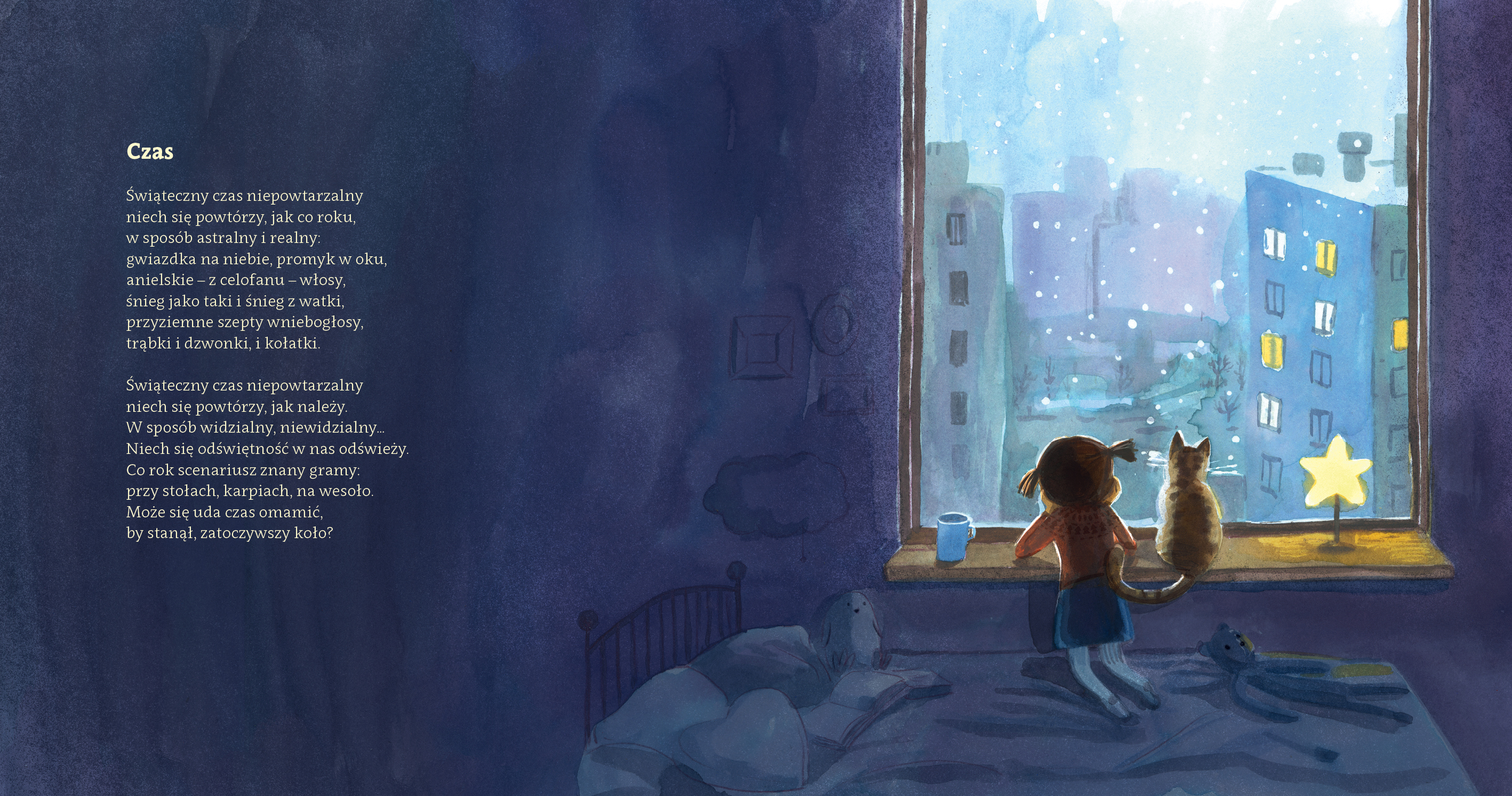 Książka jest nietypową świąteczną propozycją, ponieważ jest to zbiór świątecznych wierszyków, które z jednej strony bawią, a z drugiej potrafią zatrzymać — i skłonić nas do refleksji. Każdy utwór ozdobiony jest piękną, nastrojową ilustracją, co sprawia, że lektura staje prawdziwą przyjemnością. Ilustracje są dziełem Joanny Rusinek, która ma niesamowity talent w czarowaniu nastroju. Znajdziecie tu teksty takie jak „Czas”, „Angelolog” czy „Brak”, które sprawiają, że niejednej osobie łezka zakręci się w oku. W wierszach znajdziemy pewną wrażliwość, pokazującą, że warto celebrować wspólne chwile, nawet jeśli nie wszystko idzie po naszej myśli lub też różnimy się w podejściu do świąt i tradycji. To zatrzymanie się, bycie razem i poczucie wdzięczności. Utwory mogą okazać się nieco za trudne dla młodszych przedszkolaków, dlatego polecam ją przede wszystkim starszym dzieciom i dorosłym. Bywa, że wiersze poruszają głębsze tematy i dlatego doceniam, że autor tekstu nie upraszcza rzeczywistości — pokazuje emocje takimi, jakie są: czasem zabawne, czasem poważne… ale wszystkie ważne, wszystkie „do przeżycia”. Książka jest pięknie wydana, mamy tu twardą okładkę (co ja w książkach uwielbiam), mamy duży format. Świetnie sprawdzi się jako wspólna lektura z dzieckiem w okresie przedświątecznym i świątecznym. Moim zdaniem to świetna pozycja, kiedy chcecie wprowadzić dziecko w klimat świąt nie tylko przez prezenty, ale przez emocje, rozmowy i wspólne czytanie; ale także kiedy planujecie stworzyć ciepły, wspólny rytuał czytelniczy, taki ze światełkami, kocykiem i książką w dłoni.