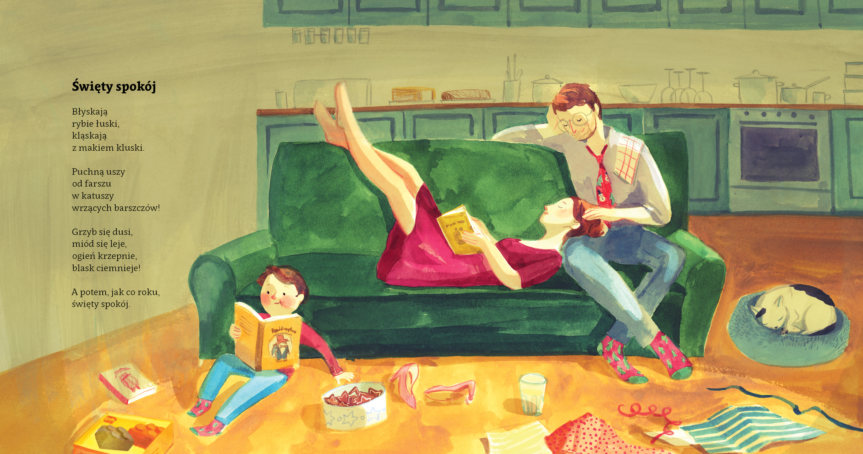 Michał Rusinek, twórca znany dorosłym i dzieciom z błyskotliwego poczucia humoru, po raz kolejny przedstawia czytelnikom zabawne, rytmiczne i pobudzające wyobraźnię wierszyki. Poruszają one tematy bliskie polskim tradycjom świątecznym – od pierwszej gwiazdki, przez przedświąteczne zakupy, przygotowywanie prezentów, kompotu z suszu i pierniczków, po święty spokój i istotę bycia razem. Teksty subtelnie przeplatają wiedzę o starych polskich tradycjach z uroczymi rymami, idealnie trafiając do czytelników w każdym wieku. Dzięki temu ich wspólne czytanie jest doskonałym pomysłem na spędzanie wieczoru w rodzinnym gronie.