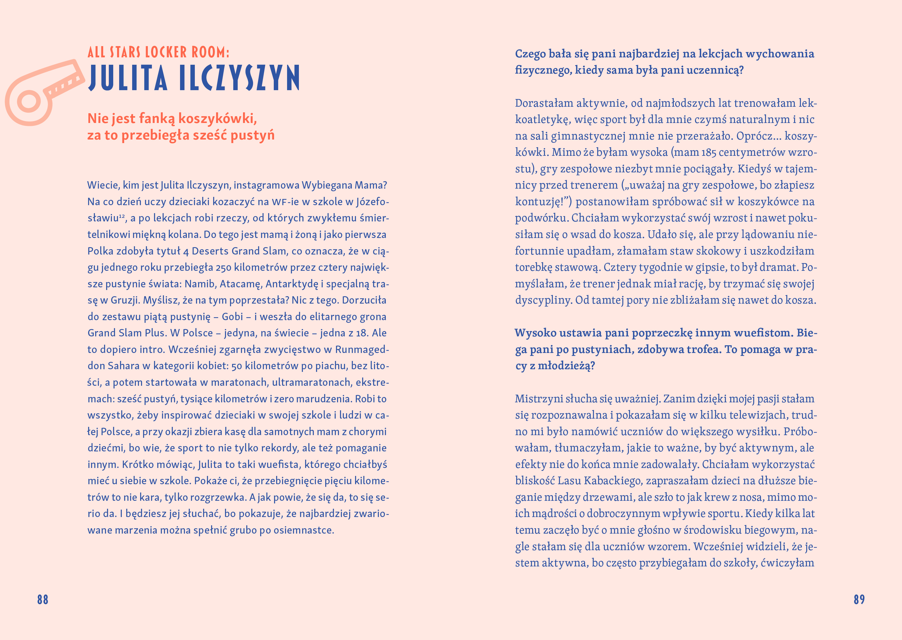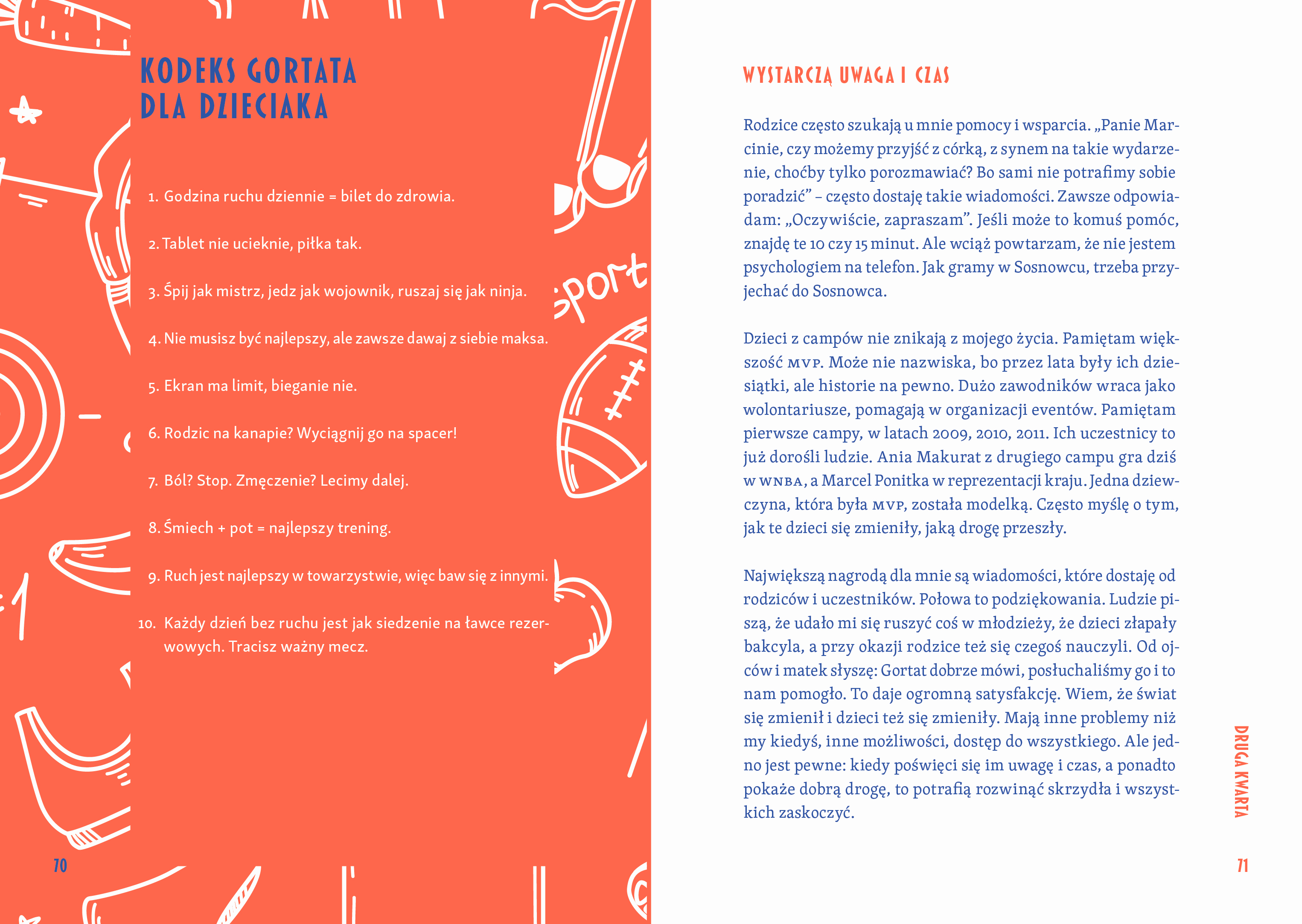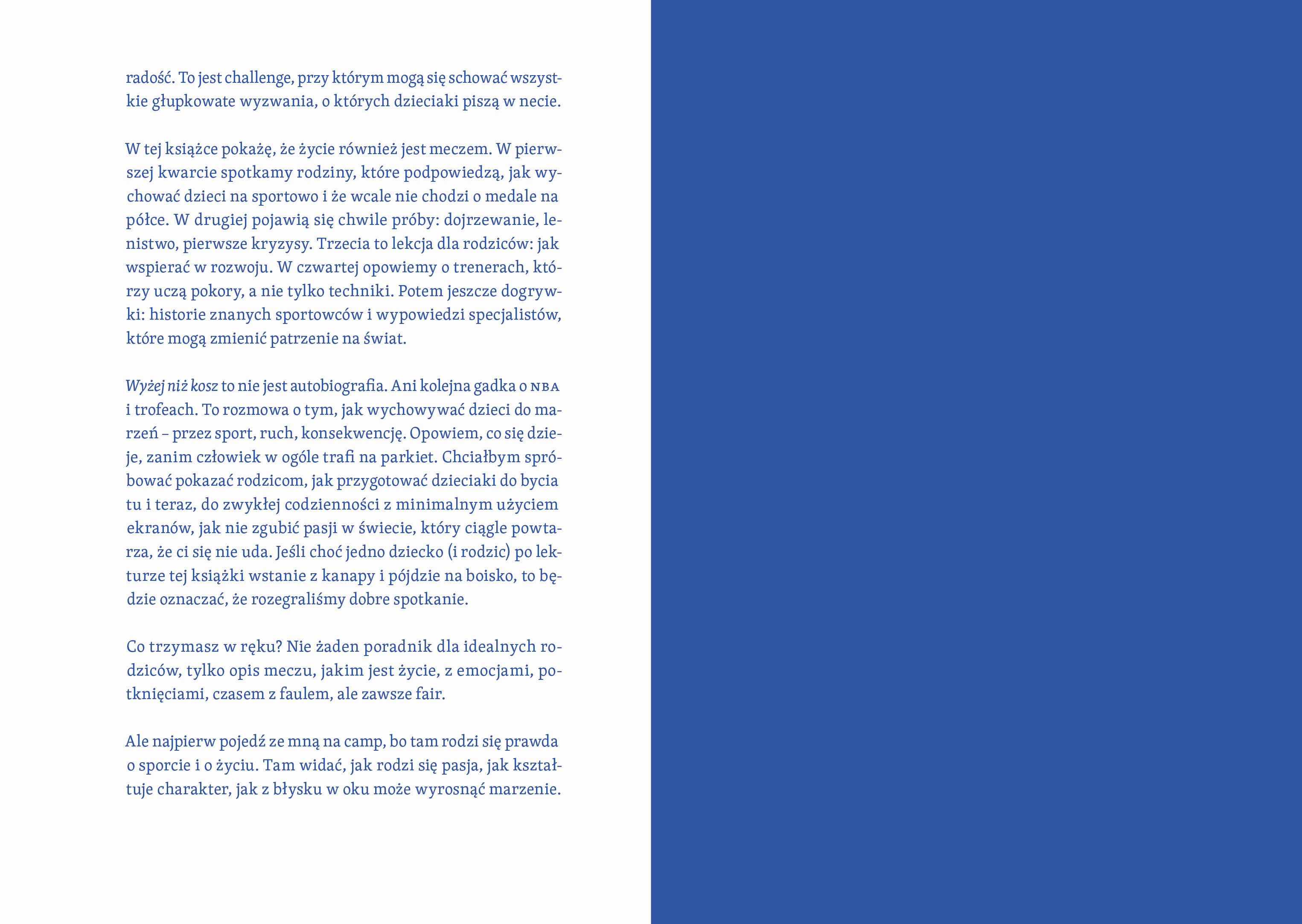 To nie jest podręcznik dla rodziców przyszłych mistrzów olimpijskich, bo każde dziecko jest inne. Nie ma jednej „instrukcji obsługi”, ktoś ma talent, ktoś inny serce do walki, a jeszcze ktoś woli podwórko od hali treningowej. Pokażemy ci, jak rozbudzić w dzieckupasję do ruchui nauczyć je sięgać po marzenia. Znajdziesz tu też zapis mojej historii – chłopaka z Łodzi, który dzięki ciężkiej pracy dotarł do NBA i zaszedł dalej, niż ktokolwiek przypuszczał.