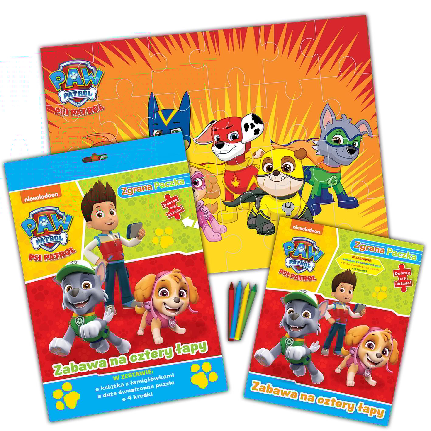 Zestaw Zgrana paczka, ruszaj na wspaniałą przygodę. Megapaczka zawiera książkę z mnóstwem zadań i łamigłówek, kolorowe kredki oraz dwustronne puzzle. Jeden z obrazków układanki można pokolorować według własnego pomysłu. Zgrana Paczka naprawdę dobrze się układa. Sprawdź to! Produkt zawiera zawieszkę na euro haczyk.