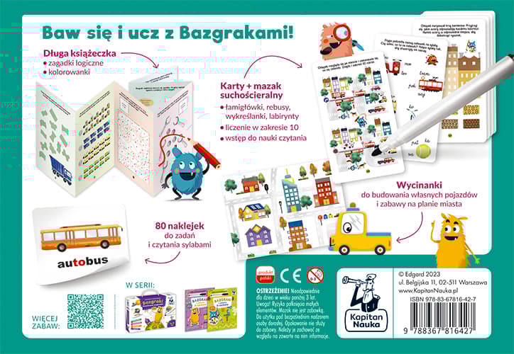 Zgaduj, rysuj, ścieraj i baw się z Bazgrakami! Czas na niezwykłą podróż do wielkiego miasta! Gdzie chcą dotrzeć sympatyczne Bazgraki? Jakimi pojazdami będą poruszać się w miejskiej dżungli, a jakimi na placu budowy? Co oznaczają znaki drogowe? Zabawy edukacyjne. Bazgraki. Super pojazdy (5–6 lat) to zestaw twórczych i edukacyjnych zabaw, dzięki którym starsze przedszkolaki będą rozwijać umiejętność liczenia, pisania, czytania i myślenia logicznego oraz poznawać miejską przestrzeń. W poręcznej walizeczce znajdują się długa książeczka z ćwiczeniami, 80 kolorowych naklejek do zadań i czytania sylabami, materiały do wycięcia i tworzenia pojazdów oraz zabaw na planie miasta, a także karty z mazakiem suchościeralnym, dzięki czemu zadania można rozwiązywać bez końca. Różnorodne zabawy rozwijają umiejętności liczenia w zakresie 10, tworzenia prostych sekwencji i algorytmów, dzielenia wyrazów na głoski i sylaby, szacowania oraz porównywania. Atrakcyjna tematyka pojazdów zachęca do rozwiązywania łamigłówek i wspólnych wycieczek po mieście. Zabawy edukacyjne. Bazgraki to seria rozwijających łamigłówek, który zapewnia przedszkolakom wiele godzin twórczej rozrywki, a przy okazji ćwiczy myślenie logiczne, spostrzegawczość oraz precyzję i motorykę małą. Zabawy edukacyjne. Bazgraki to: - nauka liczenia w zakresie 10 - wstęp do czytania i pisania - trening myślenia logicznego - rozwój spostrzegawczości i koncentracji - doskonalenie koordynacji oko-ręka Autorki: Bożena Dybowska – pedagog, nauczycielka edukacji wczesnoszkolnej Anna Grabek – pedagog, matematyczka Ilustracje: Danka Fukowska, Katarzyna Urbaniak W serii: Zabawy edukacyjne. Bazgraki. Kosmiczna wyprawaSzczegółowe informacje na temat książki Zabawy edukacyjne Bazgraki Super pojazdy
