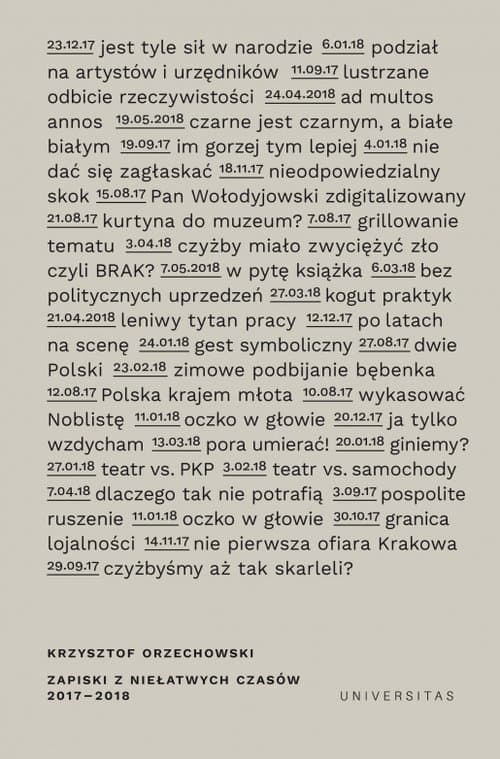 Nowa książka [Krzysztofa Orzechowskiego], podobnie jak poprzednia, złożona jest z systematycznie prowadzonych zapisków sprowokowanych bieżącymi wydarzeniami. Są jednak między obu tomami istotne różnice, na co wskazują już tytuły. W pierwszym przypadku: Teatr świata – świat teatru, obecnie – Zapiski z niełatwych czasów. Teraz teren obserwacji jest niewątpliwie szerszy. Przykładowo: mieszczą się tu muzealne wystawy i programy telewizyjne (rozrywka, kabaret), aktualna „polityka kulturalna” i polski antysemityzm, skojarzenia i przeżycia związane za świętami Bożego Narodzenia, sens narodowego czytania Wesela i apel o godne jej wartości miejsce w kulturze dla poezji Norwida, polscy skoczkowie narciarscy na olimpiadzie i błędna organizacja ruchu samochodowego w śródmieściu Krakowa tudzież jej negatywny wpływ na walkę ze smogiem, wreszcie – różnice w zainteresowaniach i umiejętnościach młodych reżyserów filmowych i teatralnych. Listę można kontynuować. Nie oznacza to jednak zepchnięcia na drugi plan spraw teatru, współczesnego życia teatralnego i środowiska teatralnego.