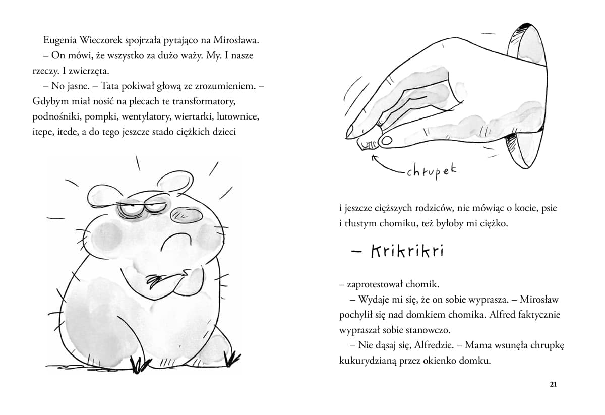 W podróżującej autobusem amfibią rodzinie Wieczorków każdy jest geniuszem: matka Eugenia (wynalazczyni), ojciec Gerard Filip (entomolog), a także dzieci: Mirosław, Bogumiła, Marcelina i niemowlak Dydyś (choć o talentach tego ostatniego jeszcze niewiele wiadomo). Wyjątkowo uzdolnione są także należące do rodziny zwierzęta: pies As, kotka Aspiryna, chomik Alfred i świerszcz Anastazja. I to się już niebawem bardzo przyda, ponieważ Gerard Filip zostaje… PORWANY! Przez żądną zemsty bandę mściwych… Ale o tym dowiecie się już z książki.