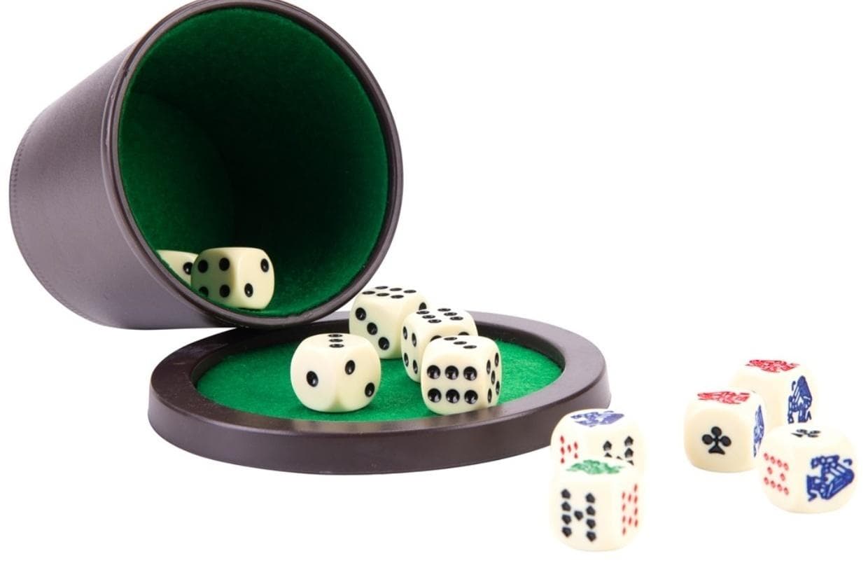 Kompletny zestaw do gry w kości kubek, tacka, 5 kości pokerowych, 6 kości oczkowych