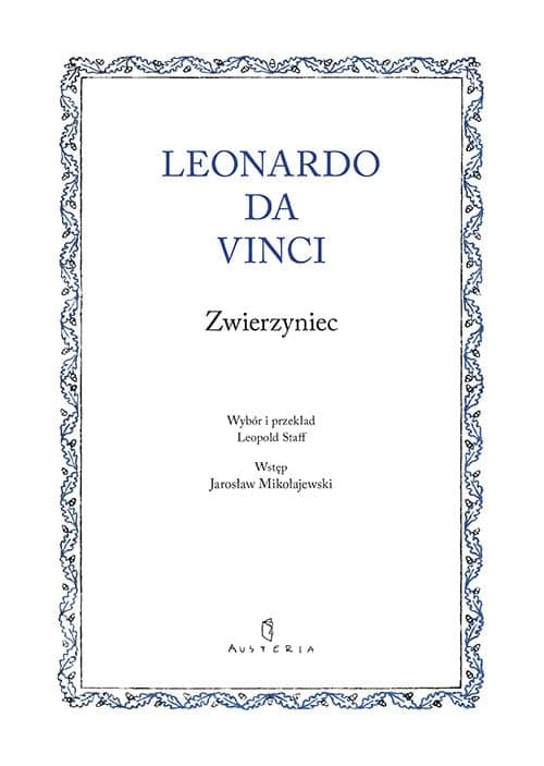 Respekt dla zwierząt i pokusa nadawania im znaczeń towarzyszyły Leonardowi od sławnego dziecięcego snu o sępie, który tak bardzo zainspirował do działań badawczych Zygmunta Freuda. Dla Leonarda zwierzę miało byt co najmniej dwojaki: istniało w swojej szczególności, było też metaforą ludzkich charakterów i skłonności. Każde zwierzę samo w sobie było dla niego ciekawe, kuriozalne, inne niż wszystko – jak dudek, który w sposób nie znający porównań opiekuje się rodzicami, kiedy spadnie na nich niedołężna starość. Zwierzęta mogą być dla niego mapą skrajności, od słonecznego bieguna, na którym turkawka «nie oszukuje nigdy swego towarzysza i jeśli jedno z nich umrze, drugie zachowuje wieczną czystość i nigdy nie siada na zielonej gałęzi i nigdy nie pije czystej wody», do bieguna nocy, gdzie nietoperz «z powodu swej nieokiełznanej chutności nie przestrzega zgoła powszechnego sposobu rozkoszy; lecz samiec z samcem, samica z samicą, tak, jak się znajdą przypadkiem, spółkują z sobą wzajem». Dla Leonarda świat zwierząt realnych nie jest wyczerpujący. Stwarza, lub odtwarza z bestiariów i legendariów, ze snów i z wyobraźni, istoty nierzeczywiste, jak jednorożec czy bazyliszek, i nie ma w tym nic dziwnego: dla tego artysty, jak dla Dantego Alighieri, fakt, że czegoś lub kogoś nie widział, nie może oznaczać, że ten ktoś albo to coś nie istnieje. Jak czytać Zwierzyniec Leonarda? Dowolnie. Tak, jak pozwalają nam go odbierać fantazja, ciekawość, podejście do literatury, od której jedni oczekują zabawy, inni nauki, jeszcze inni wglądu do przepastnej osobowości, a taką przecież osobowością był Leo­nardo da Vinci’. (ze wstępu Jarosława Mikołajewskiego)